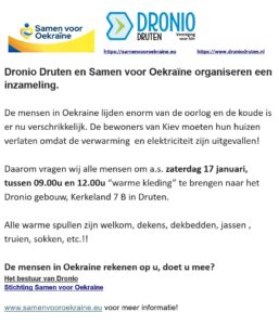 Na het grote succes van vorig jaar en de enorme behoefte naar warmte in Oekraine heeft Dronio Druten aangeboden weer een inlever moment te plannen, deze vind plaats op zaterdag...